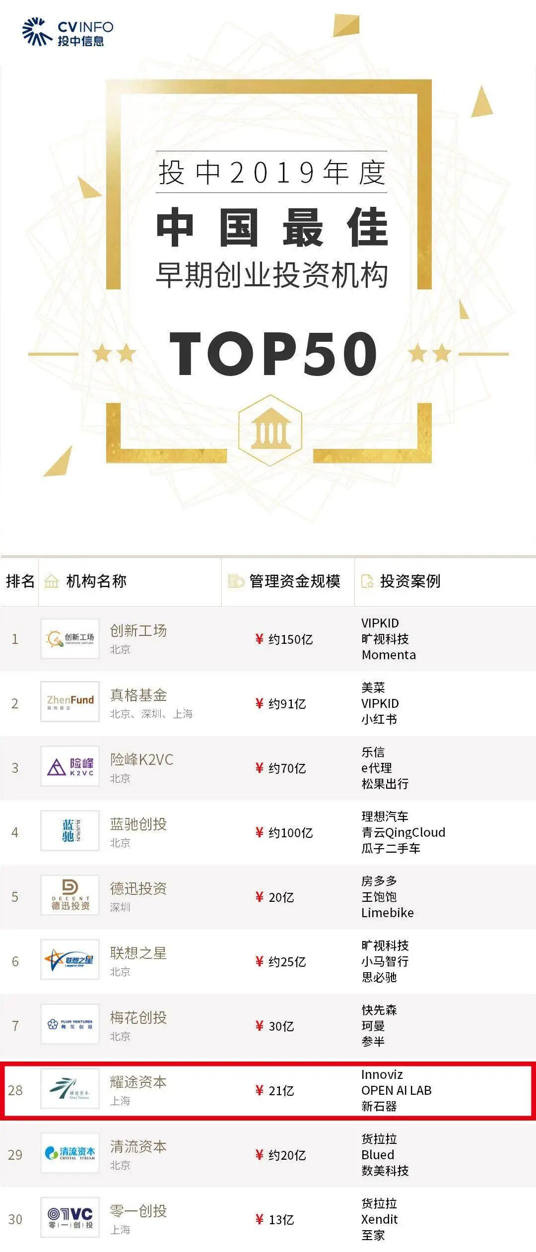 2019年度最佳早期创业投资机构TOP 30